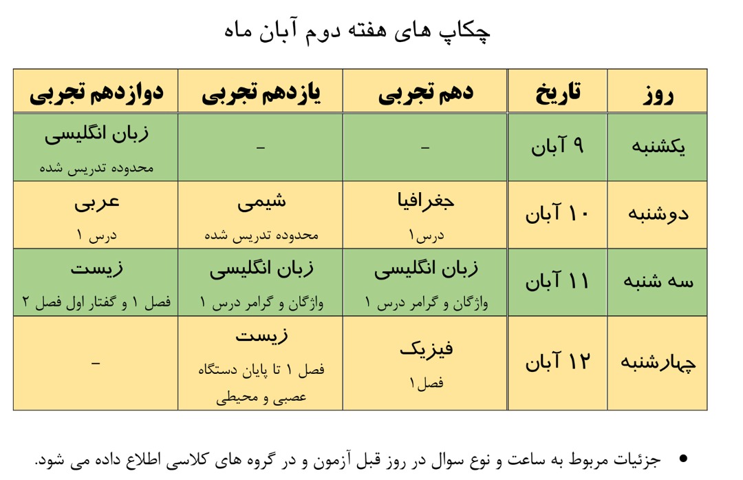 برنامه چکاپ (آزمون) های هفته دوم آبان ماه گروه تجربی (اطلاعات تکمیلی در مورد ساعت و ... روز قبل از چکاپ در گروههای کلاسی و گروه اولیا گروه تجربی قرار می گیرد)